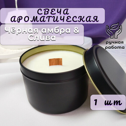 Свеча Ароматическая "Чёрная амбра & Слива"/ Свеча в банке из кокосового воска с деревянным фитилём, 100% ЭКО, 1шт