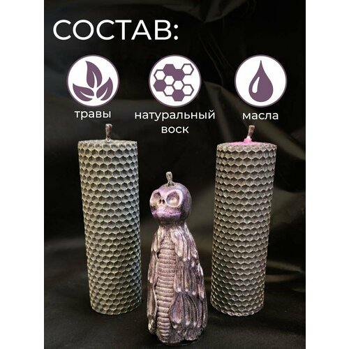 Свеча изготовлена из натурального воска и имеет приятный травяной аромат. Она имеет фигурную форму и черный цвет, что придает ей таинственности и загадочности.