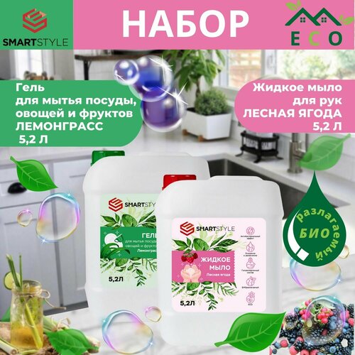 Набор SMARTSTYLE Гель для мытья посуды, овощей и фруктов Лемонграсс 5,2 л, Жидкое мыло для рук Лесная ягода 5,2 л
