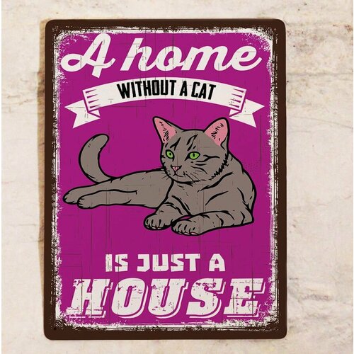 Жестяная табличка с надписью Дом без кота - всего лишь здание, металл, 20х30 см.