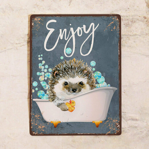 Картина в ванную комнату Enjoy с ежиком, металлическая картина с эмалью для декора стен влажных помещений, металл, 20х30 см.