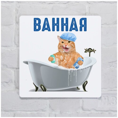 Табличка на дверь ванной Ванная с котом прикольная, пластик с готовым креплением, 20х20 см.