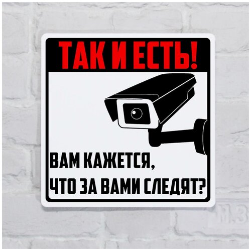 Табличка видеонаблюдение прикольная белая, пластик с готовым креплением, 20х20 см.