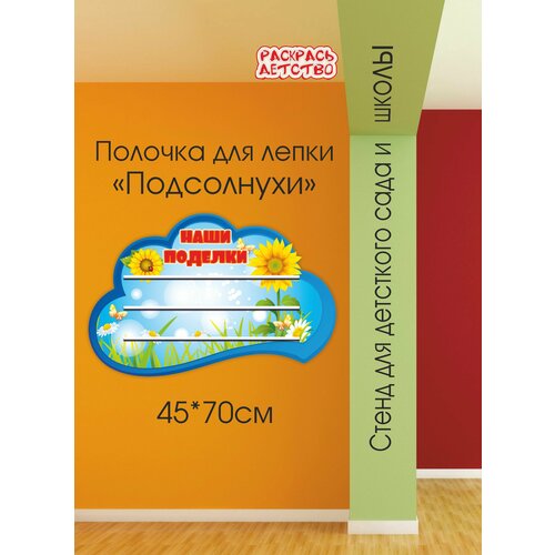 Полочка для лепки в детский сад Подсолнухи 60х40см 3 полочки для поделок настенная
