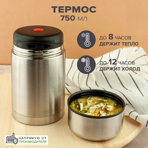 стальТермос 0,5 литра для еды с широким горлом, который подходит для сохранения температуры супов, вторых блюд, детского питания, чая и даже мороженного. Объем 500 мл. Размеры: диаметр горла 8 см, высота с крышкой 15 см, высота без крышки 13,5 см, диаметр дна 10 см. Универсальный термос с широким горлом выполняет функции термоса для еды (в качестве термоса для супа, первых и вторых блюд) и термоса для напитков (в качестве термоса для чая и кофе). Двойные стенки изделия позволяют долго сохранять температуру, как холодного, так и горячего напитка. Верхняя крышка служит одновременно чашкой или пиалой. Она снабжена уплотнительными элементами и герметично закрывает горловину, также есть кнопка для разряжения давления в колбе. Для максимального термоэффекта рекомендуем предварительно обдать кипятком, а после залить горячий напиток. Вакуумный термос выполнен из качественной пищевой нержавеющей стали. Сохраняет тепло до 8 часов и холод до 12 часов. Можно использовать термос на природе, охоте, рыбалке, пикнике, прогулке в