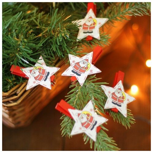 Набор новогоднего декора на прищепке, 6 шт. "Звёздочки с Дедом Морозом"