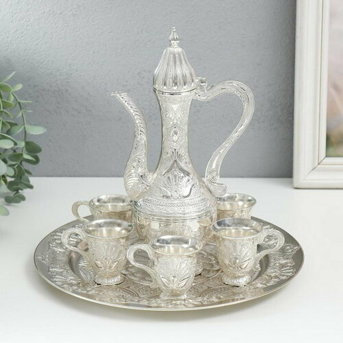Набор винный кувшин, 6 бокалов и поднос "Стамбул. Медальон и узоры" серебро