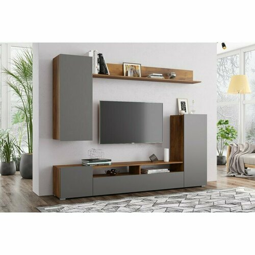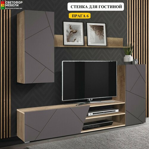 Стенка для гостиной Прага 6 Дуб каньон/Софт грей, ЛДСП/МДФ, для дома, дачи, 1970х1600х350, олмеко