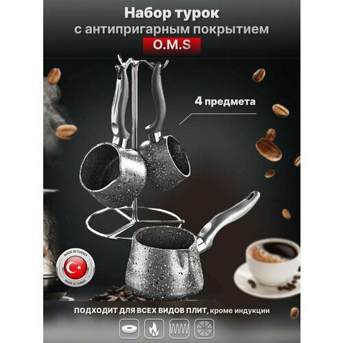 Набор из 3 турок на подставке. O.M.S. Collection. Антипригарное покрытие. 190 мл, 260 мл, 400 мл. Цвет: серый.