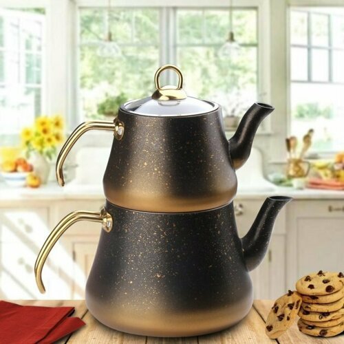 Набор из 2 чайников. O.M.S. Чайник для плиты 3,75 л, заварочный чайник 1,8 л. Черно-золотой.