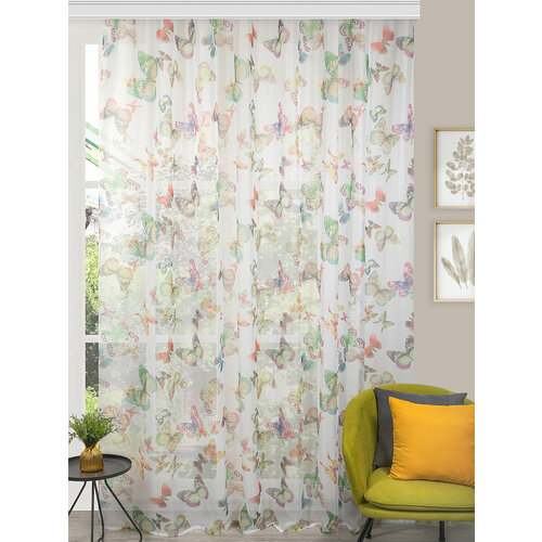 Тюль вуаль с рисунком / для интерьера гостиной, спальни, кухни / 200х270 см, на ленте / дом, дача / Бабочки / Altali