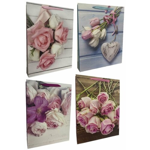 Подарочные пакеты "Розы и тюльпаны" (12 шт в наборе) в ассортименте, 31x42x12 см, 4 вида