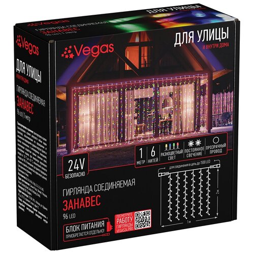 VEGAS 24V Электрогирлянда-конструктор "Занавес" 96 разноцветных LED ламп, 6 нитей прозрачный провод, 1*2 м