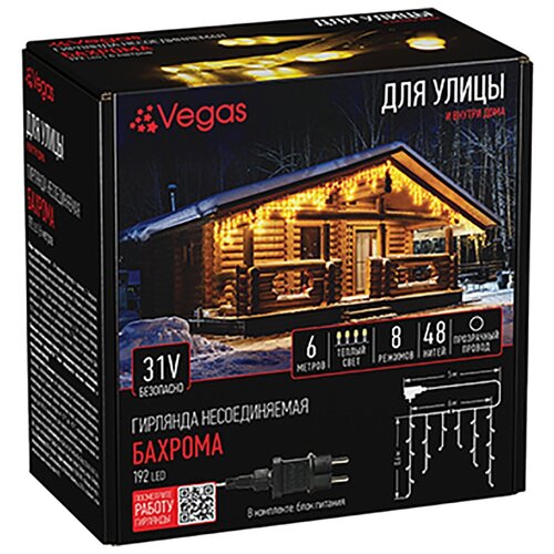 VEGAS 31V Электрогирлянда "Бахрома" 192 теплых LED ламп, прозрачный провод, 48 нитей, 6*0,6 м, 8 режимов, с блоком питания