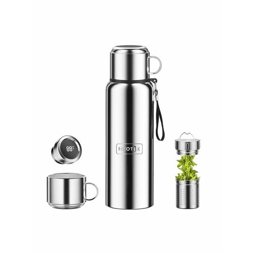 черныйУмный термос с датчиком температуры и светодиодным дисплеем – это современное и универсальное решение для любителей активного отдыха на природе, походов, рыбалки, а также незаменимый помощник в повседневной жизни. Стильный и функциональный термос изготовлен из высококачественной нержавеющей стали с двухслойной изоляцией, у крышки есть силиконовое кольцо-уплотнитель, что обеспечивает полную его герметичность и сохраняет температуру напитков до 12 часов, а ситечко для чая помогает заваривать любимый напиток прямо в термосе с большим комфортом. Особенность этого термоса – встроенный датчик температуры. Теперь вы всегда будете знать, какая температура у напитка внутри. Нужно лишь прикоснуться к крышке термоса, и светодиодный датчик отобразит информацию о температуре. Больше не нужно проверять ее «на глаз», это поможет избежать неприятных последствий, например, ожогов. Термос оснащен удобным ремешком для переноски, который выдерживает вес до 7 кг, а также удобной кружкой с ручкой для более комфортного чаепития в п