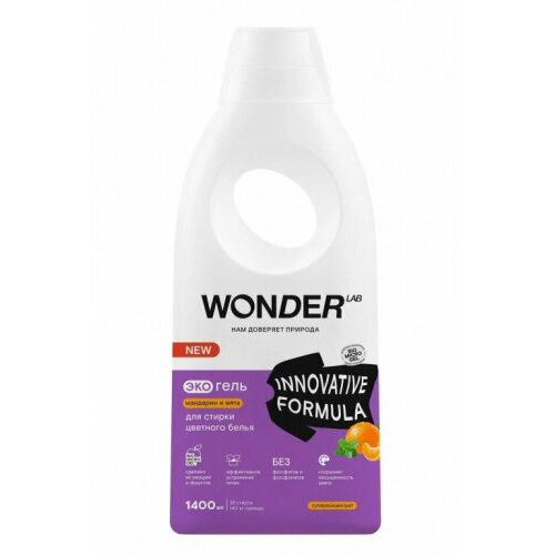 Гель для стирки цветного белья WONDER LAB, экологичный и гипоаллергенный гель для стирки одежды, с ароматом мандарина и мяты, 1400 мл