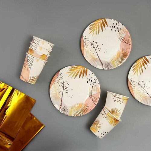 Набор бумажной посуды "Золотой узор! Природа": 6 тарелок, 6 стаканов, скатерть