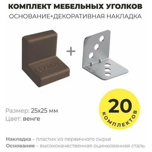 Уголок мебельный крепежный, 25*25 мм, с пластиковой крышкой, Grandis , цвет венге , комплект 40 шт