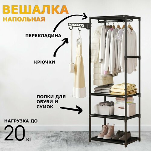 Вешалка для одежды и обуви, напольная металлическая, стеллаж с полками, 60 см, черная
