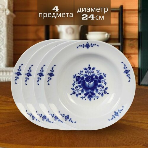 Набор глубоких тарелок 24 см 4 шт. Объединение гжель. Рисунок "Гжельский букет №2". Фарфор.