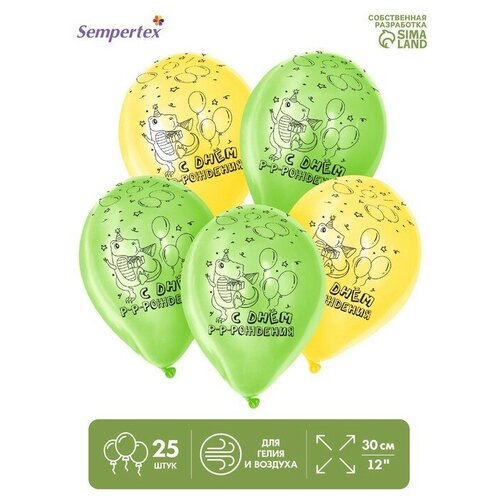 Шар латексный 12" «С Днём рождения. Динозаврики», пастель, набор 25 шт, цвет жёлт, зелён.