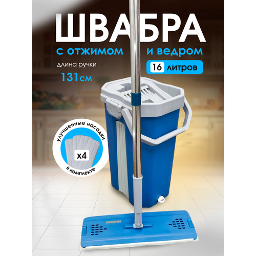 Швабра с отжимом и ведром, комплект для уборки и мытья пола, 4 сменные насадки в комплекте, ведро 16 литров синяя