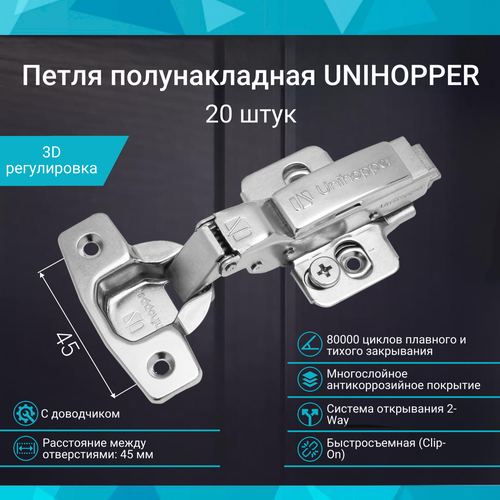 Петля мебельная полунакладная 45 мм с доводчиком UNIHOPPER быстросъемная Clip-On, комплект 20 штук