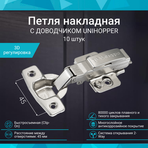 Петля мебельная накладная 45 мм с доводчиком UNIHOPPER быстросъемная Clip-On, комплект 10 штук