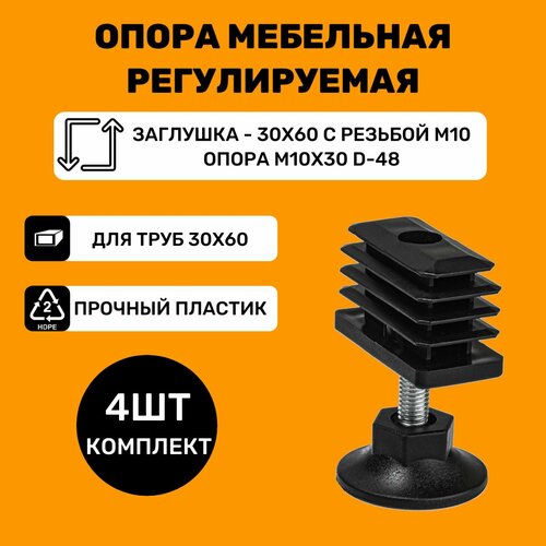 Мебельные регулируемые опоры для труб 30х60 мм / в комплекте заглушки 30x60 с резьбой М10 и опоры М10х30-d48мм / Ножки для мебели (4 шт.)