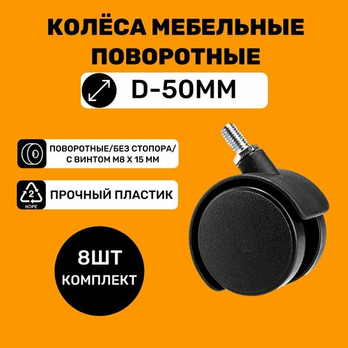 Мебельные колёса поворотные D50мм с винтом М8х15 мм, без стопора (8 шт.)