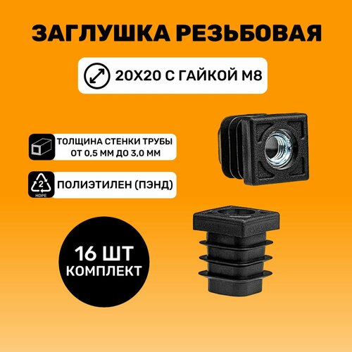 Заглушка резьбовая 20х20 с гайкой М8 цвет Черный (16 шт.)