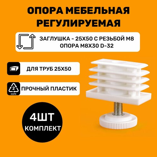 Заглушки ножки резьбовые 25х50 мм с гайкой М8, в комплекте с регулируемыми опорами М8х30 с шапкой d32мм. Ножки для мебели (4шт)