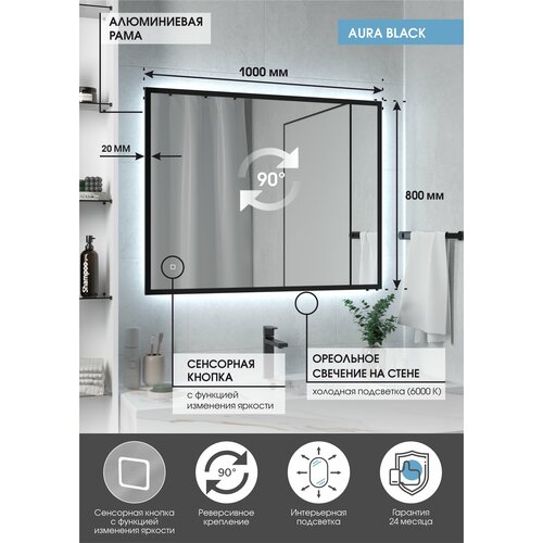Зеркало MAXMIRRORS для ванной, прямоугольное в черной алюминиевой раме Aura Black 100х80 см c LED холодной фоновой подсветкой, сенсор с диммером