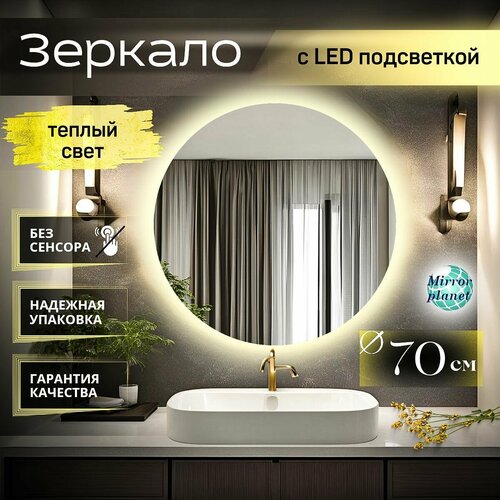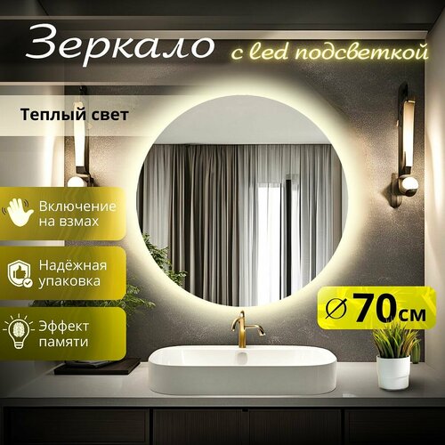 Зеркало настенное с подсветкой круглое для ванной 3000К теплый свет регулировка подсветки сенсорное управление на взмах 70 см Mirror planet