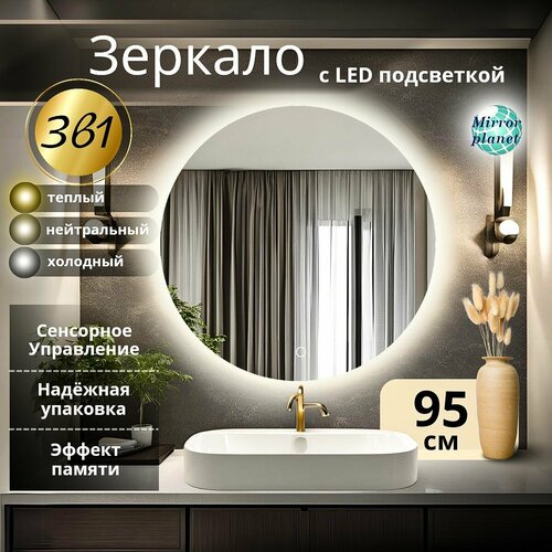 Зеркало для ванной с подсветкой круглое настенное с сенсорным управлением и изменением цвета подсветки 3в1 диаметр 95 см