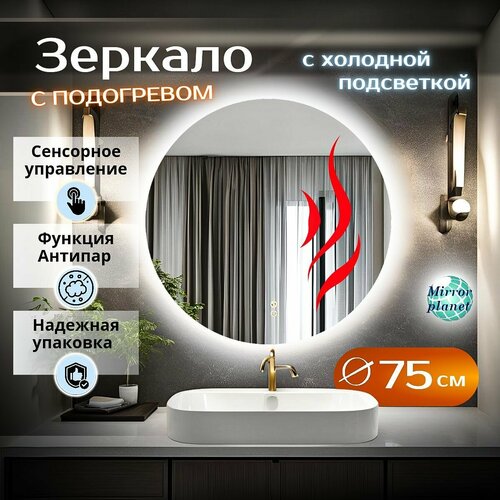 Зеркало для ванной с подсветкой круглое настенное с сенсором регулировкой яркости 6000К холодный свет с подогревом диаметр 75 см