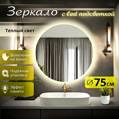 Зеркало настенное с подсветкой круглое для ванной 3000К теплый свет сенсорное управление на взмах 75 см Mirror planet