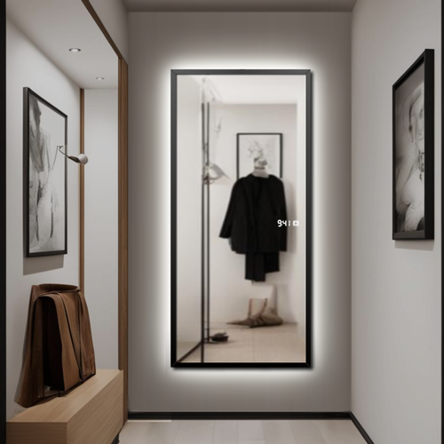 Зеркало настенное в полный рост Alias Квартал 170*60 в чёрной алюминиевой раме с нейтральной LED-подсветкой и часами