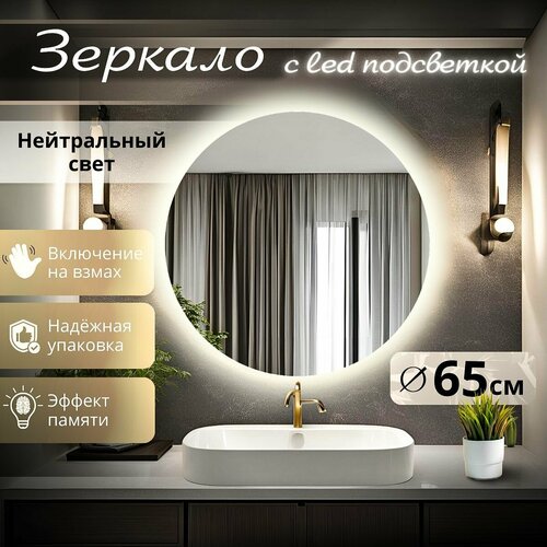 Зеркало для ванной с подсветкой круглое настенное без сенсора 4500К нейтральный свет диаметр 65 см
