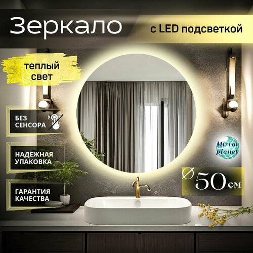 Зеркало для ванной с подсветкой круглое настенное без сенсора 3000К теплый свет диаметр 50 см