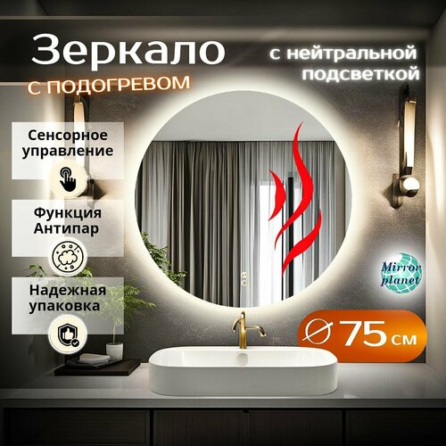 Зеркало для ванной с подсветкой круглое настенное с сенсором регулировкой яркости 4500К нейтральный свет с подогревом диаметр 75 см
