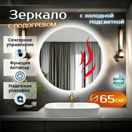 Зеркало для ванной с подсветкой круглое настенное с сенсором регулировкой яркости 6000К холодный свет с подогревом диаметр 65 см