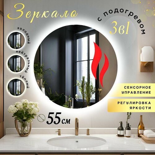 Зеркало для ванной с подсветкой и подогревом круглое настенное с сенсорным управлением и изменением цвета подсветки 3в1 диаметр 55 см