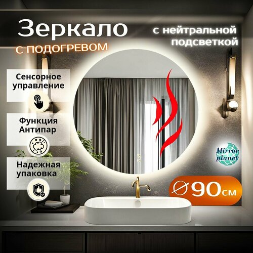 Зеркало для ванной с подсветкой круглое настенное с сенсорным управлением регулировкой яркости 4500К нейтральный свет с подогревом диаметр 90 см
