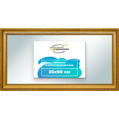 50x26 ммЗеркало в пластиковой раме изготавливается из безопасного и экологически чистого первичного полистирола высшей категории. Мы заботимся о наших покупателях, поэтому на каждое наше зеркало с обратной стороны нанесена противоосколочная защитная пленка по всей его площади. Мы следим, чтобы каждое зеркало приходило к вам идеально чистое, без отпечатков, разводов и пыли. В комплекте идет само зеркало в раме, фурнитура, подвесные пластины, винты. Толщина зеркала: 4 мм. Цвет золотой, профиль классический. Внешний размер зеркала в раме 45x95 см.