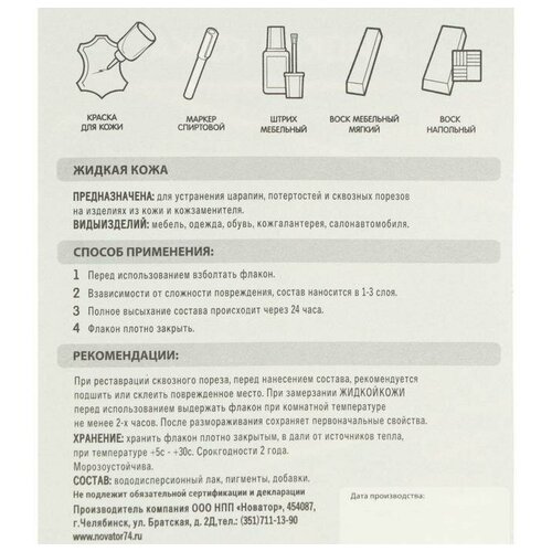 Артикул: 1964-955. Размеры: 7.5 x 2.8 x 7.5 см, Вес: 36 гр, Размер упаковки: 3 x 8 x 3 см, Форма выпуска: Жидкость, Вес, г/Объём, мл: 20, Вид: Жидкая кожа. Жидкая кожа синего цвета - эффективное средство, когда мебель, обувь, предметы интерьера имеет повреждения. Отлично справляется с царапинами, трещинами и другими мелкими деффектами. С помощью такого инструмента можно быстро и без больших затрат починить испортившуюся мебель или одежду. Предназначено для внутренних и наружных работ. Для ремонта изделий из кожи и кожзаменителя. Способ применения: подрезать все выступающие частички кожи кожи и кожзаменителя. Перед применением жидкую кожу взболтать. Нанести состав, стараясь не выходить за границы повреждения. После подсыхания 10-15 минут излишки удалить влажной тканью. Рекомендации: чтобы заполнить глубокую царапину или сквозной порез вровень со сквозной поверхностью, наносите состав в несколько слоев, предварительно дав подсохнуть предыдущему слою. В случае большого пореза, стоит наклеить материал к тыльной с