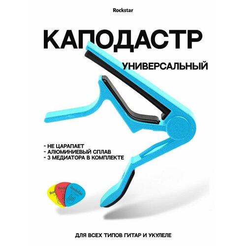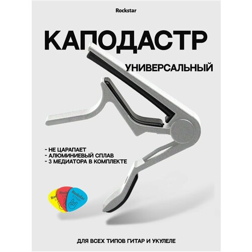 Каподастр для музыкальных инструментов, для гитары , для акустической, для классической , для укулеле, шестиструнной 6 струн, двенадцатиструнной 12 струн, каподастр и медиаторы в комплекте 3 шт . Корпус из металлического сплава, имеются мягкие силиконовые прокладки, эргономичный дизайн. Каподастр это специальный зажим, который используется изменения тональности сразу на нескольких струнах. Аксессуар предназначен для классической, басс-гитары, акустической, а также банджо, укулеле. Струны зажимаются надежно и крепко - аксессуар обеспечит чистый звук на протяжении всей игры. Каподастр черный регулируемый универсальный, который можно использовать при любом уровне и навыке владения инструментом, станет отличным подарком для человека, увлекающегося игрой на гитаре. Такое простое, но очень полезное для музыканта устройство, поможет значительно облегчить исполнение сложных композиций с баррэ и расширить репертуар.