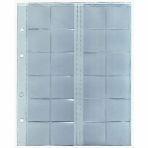 Лист для хранения монет 70 ячеек. Размер ячейки 23 х 23 мм. Размер листа 200 х 250 мм. Изготовлен из импортного прозрачного пвх.