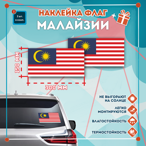 Наклейка Флаг Малайзии на автомобиль, кол-во 2шт. (300x150мм), Наклейка, Матовая, С клеевым слоем