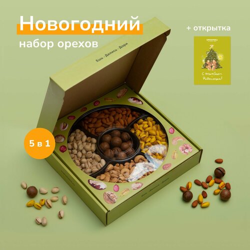 В состав подарочного набора входят 5 вкусных и свежих орехов: крупный жареный миндаль, кешью жареный, фисташки "Калифорния" жареные...